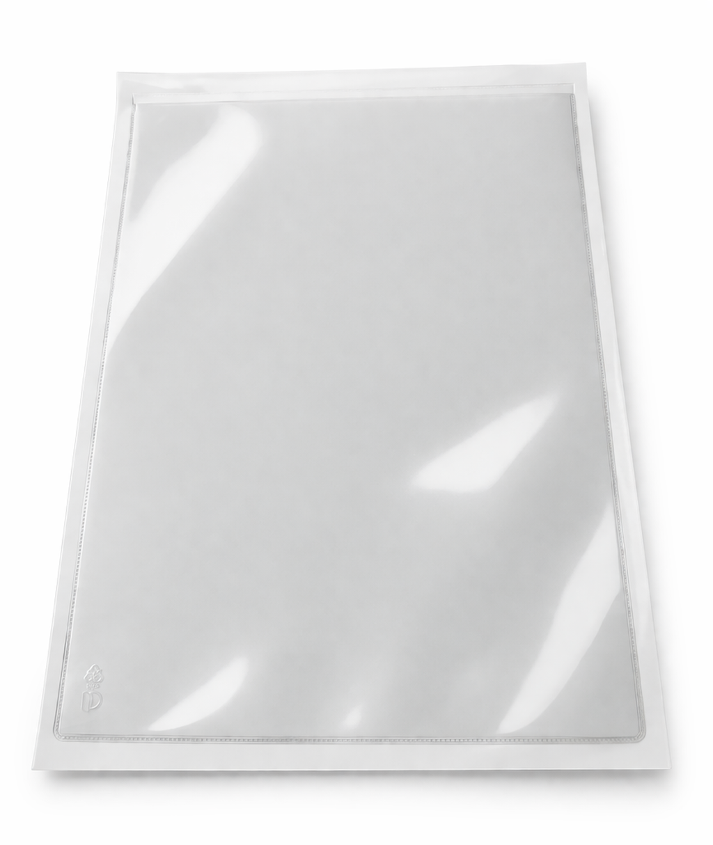 Självhäftande plastfodral / väggskylt med icke permanent lim och öppning på övre kortsidan.